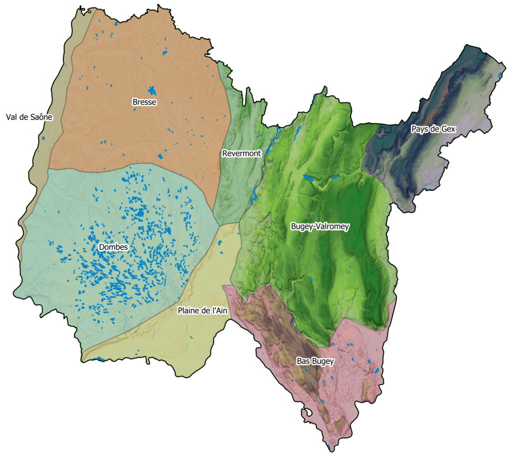 La Bresse demeure notre région la plus discrète, entre Dombes et Val de Saône. Région historiquement bocagère où la Huppe fasciée trouve encore un habitat à sa mesure, elle conserve encore la plupart de ses mystères. La Bresse abrite également des effectifs remarquables de Moineau friquet et d’Effraie des clochers, de plus en plus rares dans la région et le département. Le chant du Bruant jaune, une des espèces les plus menacées de France, persiste à se faire entendre dans les bocages qui caractérisent tant cette région de l’Ain. La Loutre et le Castor d’Europe prospèrent discrètement sur nos fleuves et rivières – le Rhône et l’Ain notamment – quand le Harle bièvre y est le représentant le plus ostensible pour le moins ! et le Petit gravelot le plus discret de notre avifaune. Le ballet du Faucon hobereau en chasse le chant flûté du Guêpier d’Europe qui le signale avant qu’on ne le voie, celui du Coucou gris et du Loriot d’Europe animent les ripisylves de l’Ain. Les observateurs les plus aguerris pourront contempler la chasse subaquatique de la Couleuvre vipérine. Sur le Haut-Rhône, quelques lônes cachent encore la rare Cistude d’Europe.
