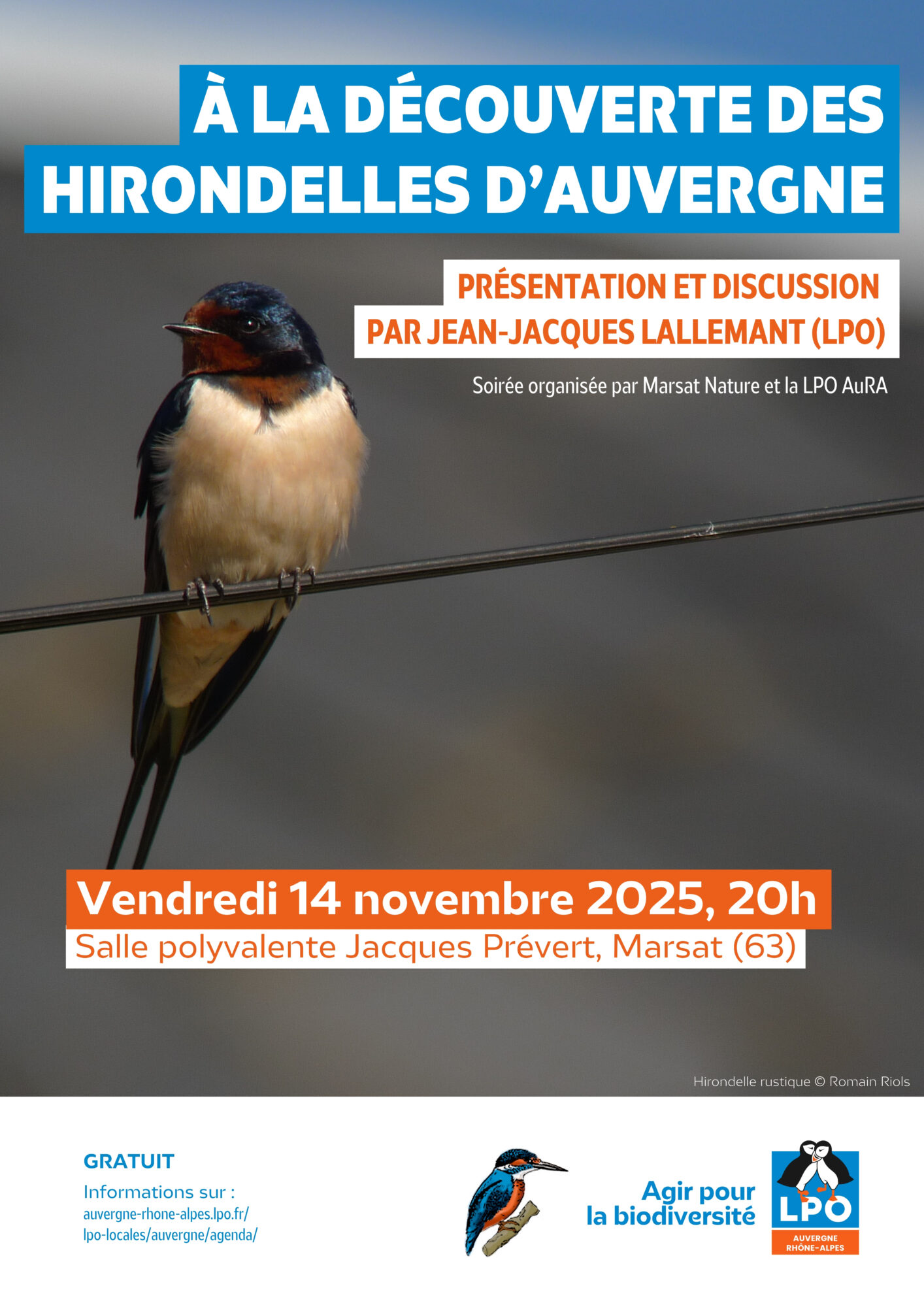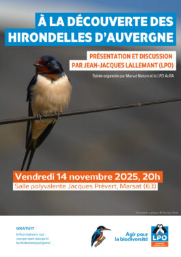 Vendredi 14 novembre, la LPO AuRA et Marsat Nature vous proposent une soirée de découverte des hirondelles d’Auvergne. Avec Jean-Jacques Lallemant, bénévole LPO, vous saurez tout de ces oiseaux remarquables et plus particulièrement de l’hirondelle rustique.