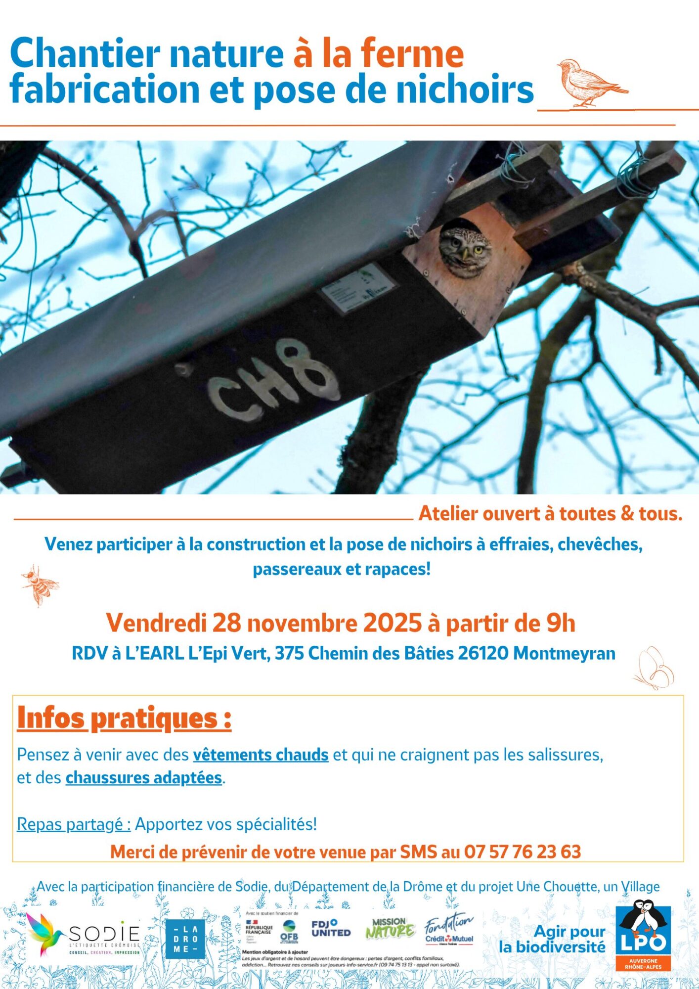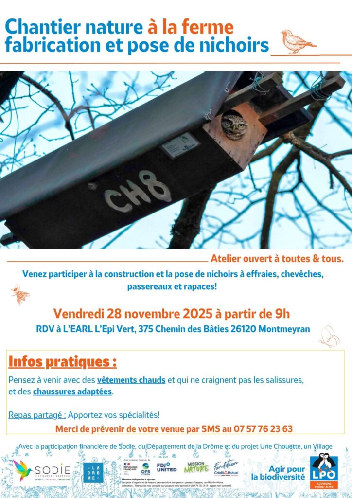 Rejoignez-nous pour une journée de fabrication et de pose de nichoirs à effraies, chevêches, passereaux et rapaces sur des fermes engagées pour la biodiversité.