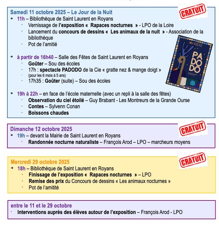 À l’occasion de la 17ᵉ édition du Jour de la Nuit, la municipalité de Saint-Laurent-en-Royans, en partenariat avec la LPO, les Montreurs de Grande Ourse, la Cantine Solidaire du Royans Vercors et le Sou des écoles, vous propose un weekend riche en découvertes et en sensibilisation à la biodiversité nocturne et à la pollution lumineuse.