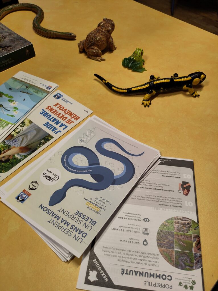 Accompagné d’une météo capricieuse, le groupe a pu découvrir en intérieur : comment différencier les espèces, où se cachent les reptiles et les amphibiens ou encore ce qu’est un protocole POP.