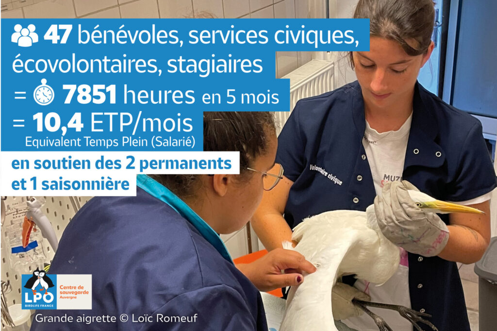 Ces 47 personnes ont effectué un total de 7851 heures de travail, ce qui représente l’équivalent de 10,4 salariés à temps plein par mois (sur une période de 5 mois). En d’autres termes, en plus des 2 salariés à temps plein en CDI et du renfort saisonnier en CDD, il faudrait au moins 10 autres personnes à temps plein. C’est-à-dire un minimum de 13 salariés à temps plein pour s’occuper des oiseaux sauvages en détresse que le Centre recueille.