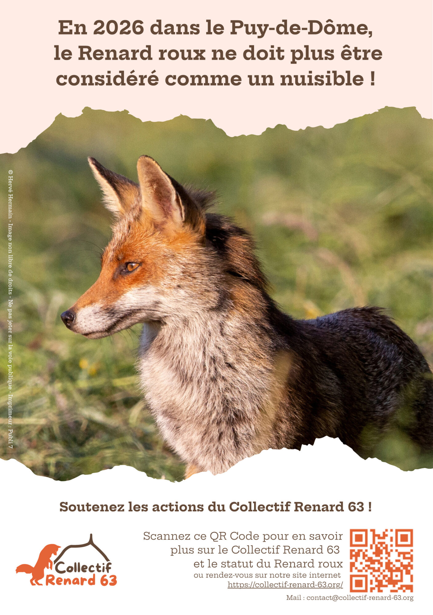 Plusieurs associations, scientifiques, naturalistes et passionnés du département se sont réunis en créant le Collectif Renard 63, à l’initiative de Panse-Bêtes et FNE 63, pour demander le déclassement du Renard roux dans le Puy-de-Dôme.
