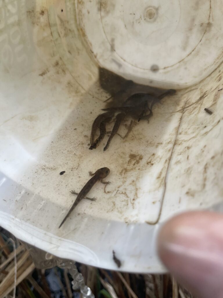 Le début de la 6ème semaine commence bien avec de la pluie annoncée. La journée de mardi a été incroyable avec 84 amphibiens sauvés dont 54 larves de salamandre. Dans un même seau, 34 larves de salamandre, l’épuisette et le seau remplis.