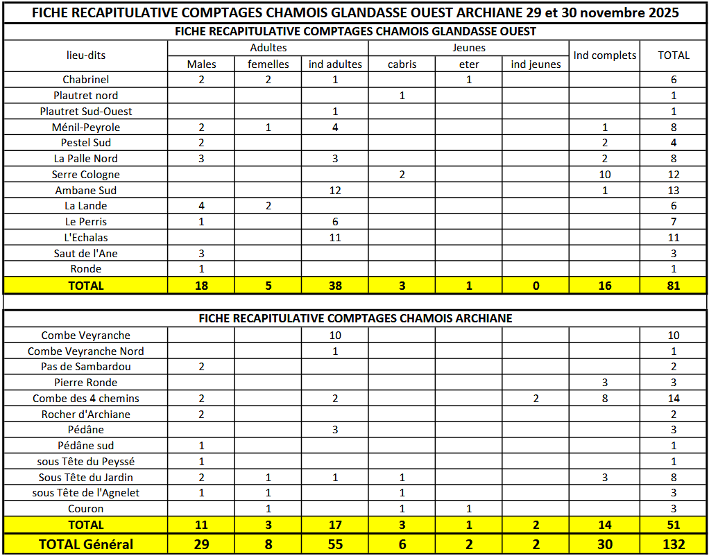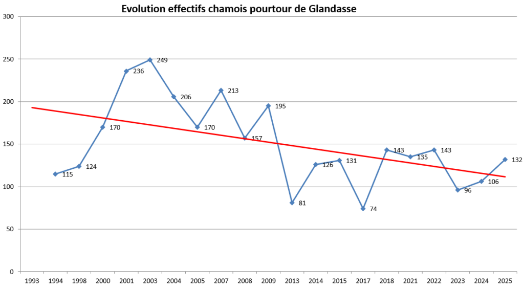 En ce qui concerne les résultats, ils sont mitigés, supérieurs à ceux des deux dernières années où ils avaient atteints leurs plus bas scores. Les comptages montrent un redressement de la courbe passant de 93 individus dénombrés en 2023 à 132 cette année. Cependant nous sommes loin des chiffres du début du siècle (2001 à 2003) où nous étions à un maximum de 249 chamois observés…