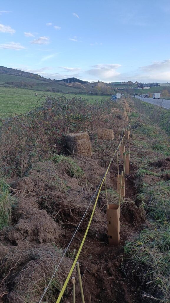 Les 7 bénévoles présents lors de cette journée conviviale ont planté 250 arbres et arbustes de 21 essences différentes (noisetier, noyer, murier, fusain, églantier, épine- vinette, érable champêtre…). Le programme de l’après-midi fut consacré à l’installation des protections des plants et le paillage.