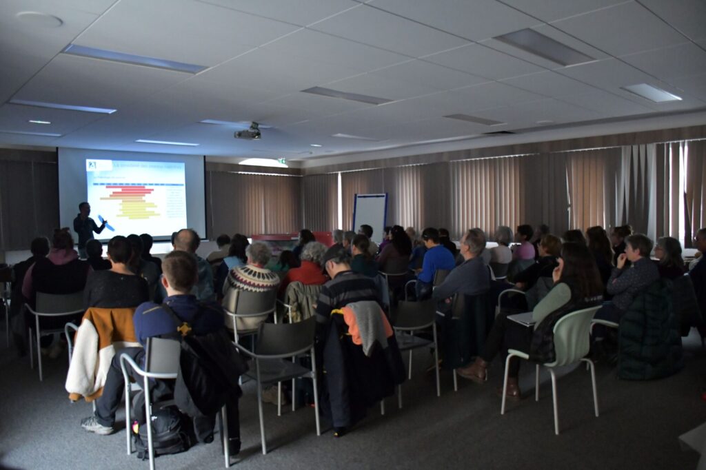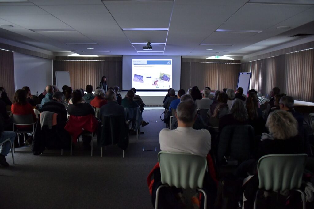 Nous étions environ 55 en salle à assister aux présentations sur le grand-duc (Sylvie Frachet – LPO), les oiseaux rupestres et la cohabitation avec l’escalade (Rémi Metais – LPO) et les sites Natura 2000 avec les mesures prises dans les petits goulets (Camille Le Bihan – PNRV).