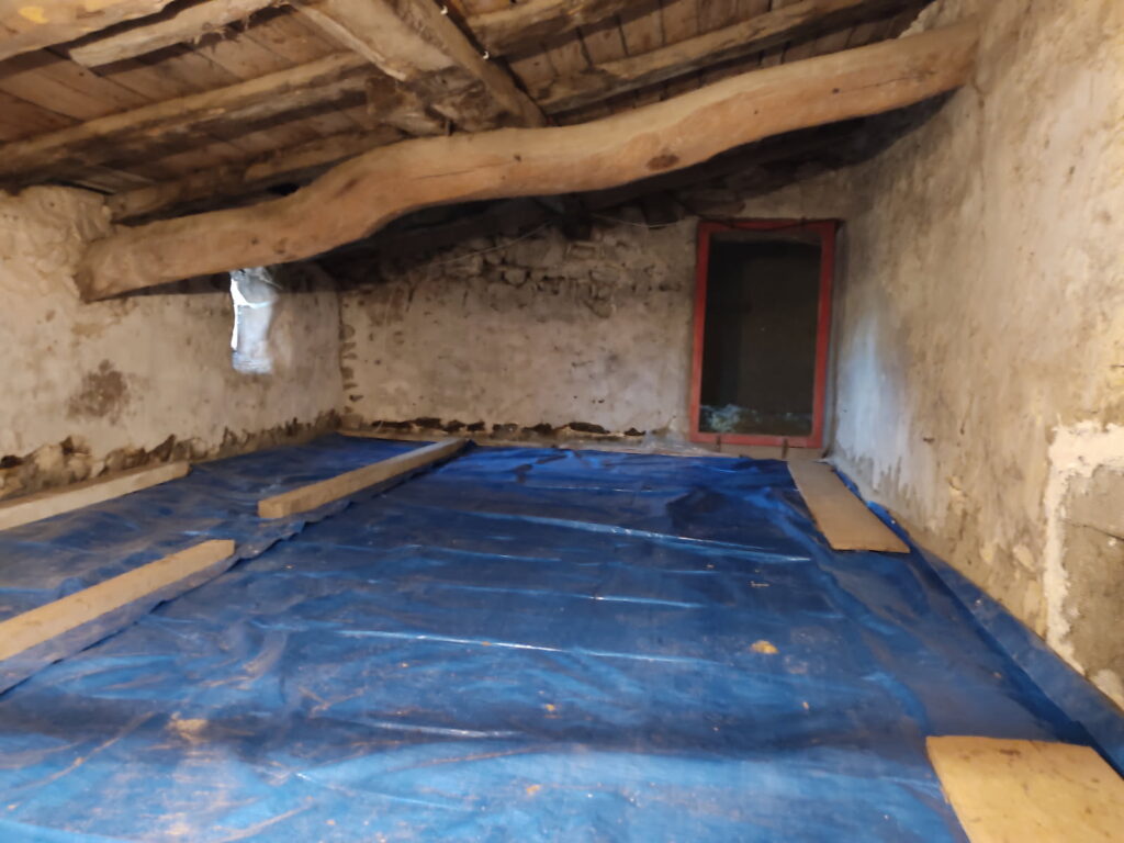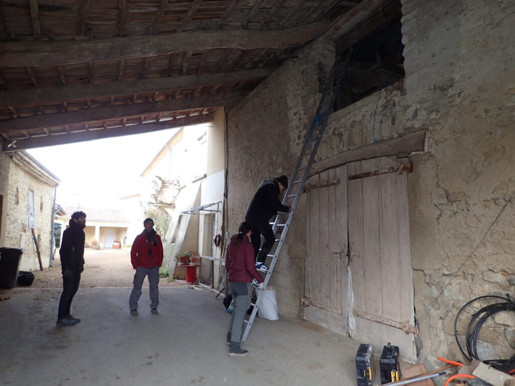 Samedi matin, nous étions 6 pour réouvrir l’accès au grenier de l’ancienne colonie de Grand rhinolophes. Accès par une échelle, débarrassage des affaires et balayage des belles galette de guano au sol, retrait du grillage sur la porte d’accès, puis pose de planches, en prenant soin de ménager un passage pour les chiroptères de taille suffisante. On a même eu le temps de poser quelques bâches pour anticiper le retour des bestioles. Espérons que ça ne porte pas la poisse… À midi c’était fini, et on a pu aller faire un casse-croute à la grotte de la dame pour fêter ça. Au final, on n’a pas pu réouvrir la totalité de l’étage, l’une des pièces comportant de la laine de verre au sol restant fermée sur demande du proprio. Mais on a quand même pu libérer une des 2 pièces utilisées historiquement, bien plus intéressante et favorable que l’appentis ouvert adjacent sous lequel une vingtaine de femelle sont venus squatter l’été dernier, peut-être faute de gite convenable ailleurs. Sur le papier c’est censé marcher… On surveillera particulièrement ce site en Mai-Juin.
