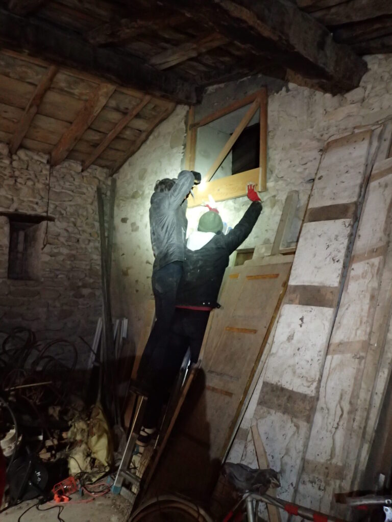 Dimanche, chez Martine à Grâne, nous étions aussi nombreux. On n’a pas exactement fait ce qui était prévu et nécessaire, mais le chantier s’est déroulé dans la bonne humeur, c’est l’essentiel. Nous avons rendu une grande pièce favorable aux chiroptères, via la fermeture d’une fenêtre, et réalisé quelques petites améliorations sur les pièces accueillant aujourd’hui les Petits rhinolophes.