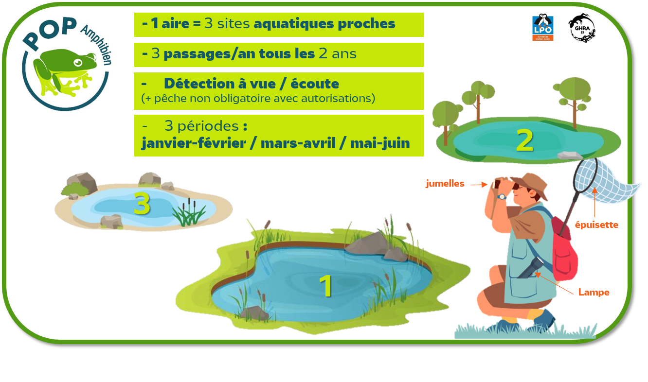 Le programme POPAmphibien Communauté est un protocole à mettre en œuvre par 3 passages annuels tous les 2 ans, sur 3 sites aquatiques préalablement identifiés.