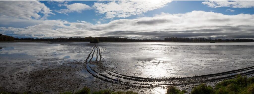 Petite surprise, l’étang a été vidé … On est en Dombes, les étangs sont munis de vannes qui permettent de les remplir (et de les vider). Pendant 3 ans on y élève des poissons puis on les vide, on pêche les poissons, on plante et on cultive pendant 1 an ou 2 ans avant de les remplir à nouveau. Et ainsi de suite…